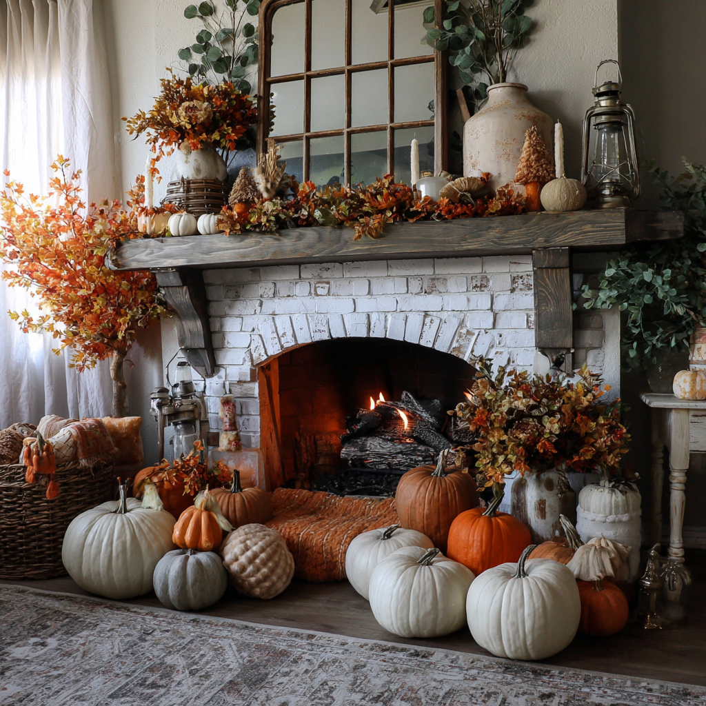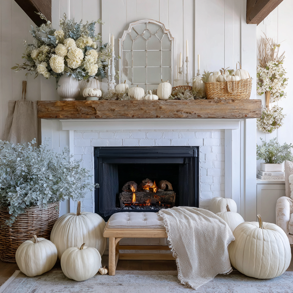 A white fireplace styled with white pumpkins creates a clean, elegant look that perfectly captures the simplicity of modern fall decor. Add touches of greenery or warm candles to bring contrast and coziness to the space while keeping the overall design soft and seasonal.