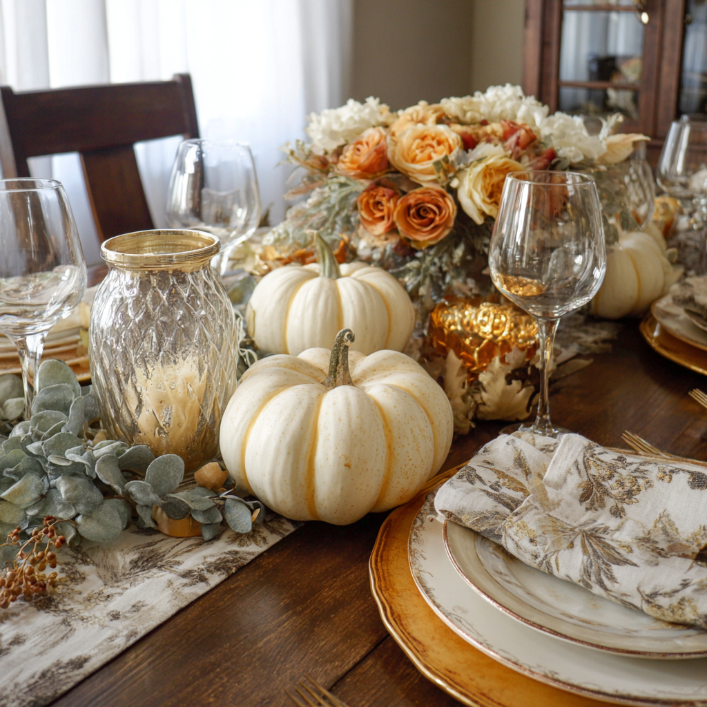 Decorate your table for fall with a charming mix of candles and pumpkins, creating a warm and inviting seasonal centerpiece. The soft glow of candlelight paired with neutral or rustic-toned pumpkins adds the perfect autumn touch to any dining or coffee table.