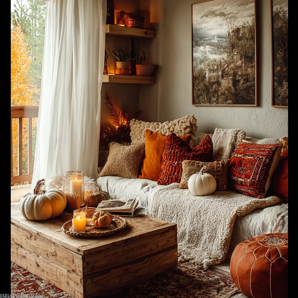 Transform a quiet nook into a cozy fall retreat with a soft couch layered in warm throws and neutral-toned pillows. Add a few white pumpkins on the side table or windowsill for a simple, elegant touch of seasonal fall decor that feels both modern and inviting.