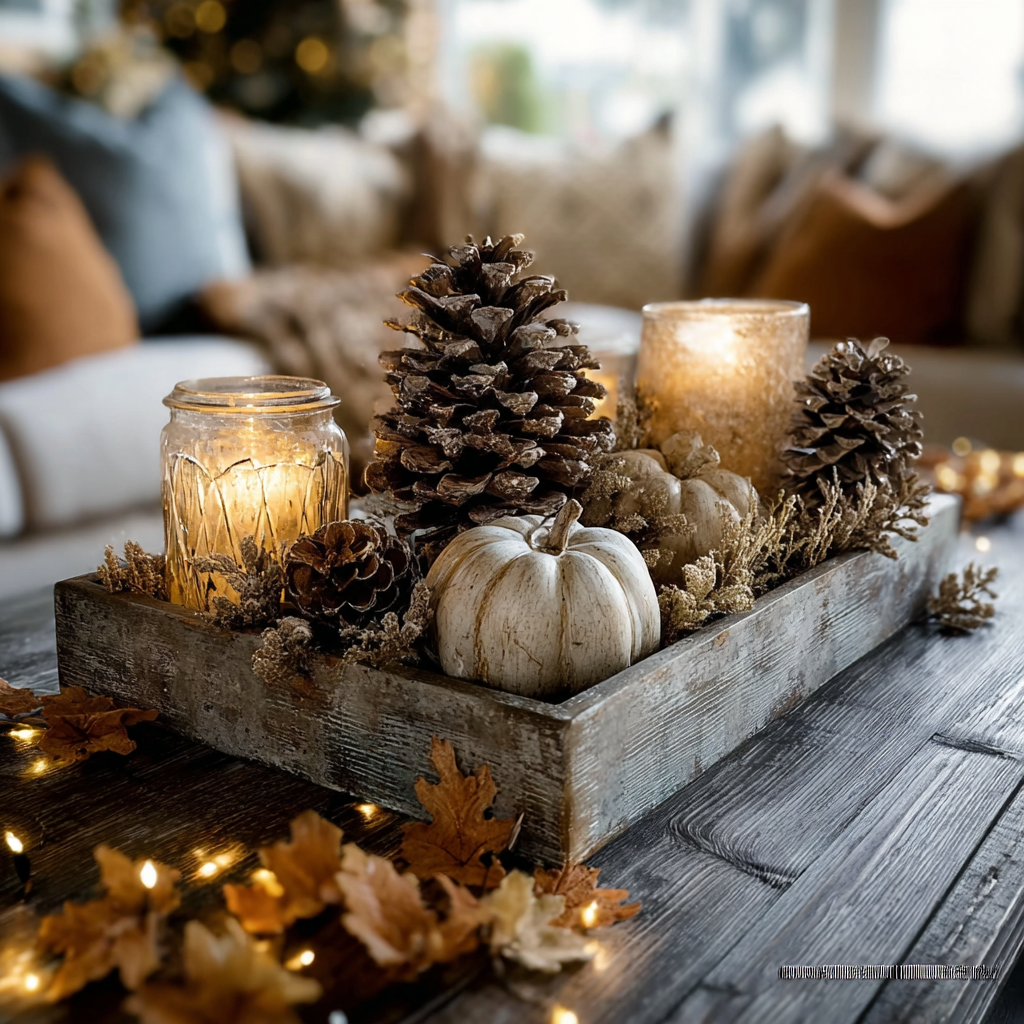 Add a natural touch to your fall living room by using pine cones as simple table decor, either scattered across a tray or arranged in a rustic bowl. Their earthy texture pairs beautifully with candles, pumpkins, or greenery for a warm and inviting seasonal look.